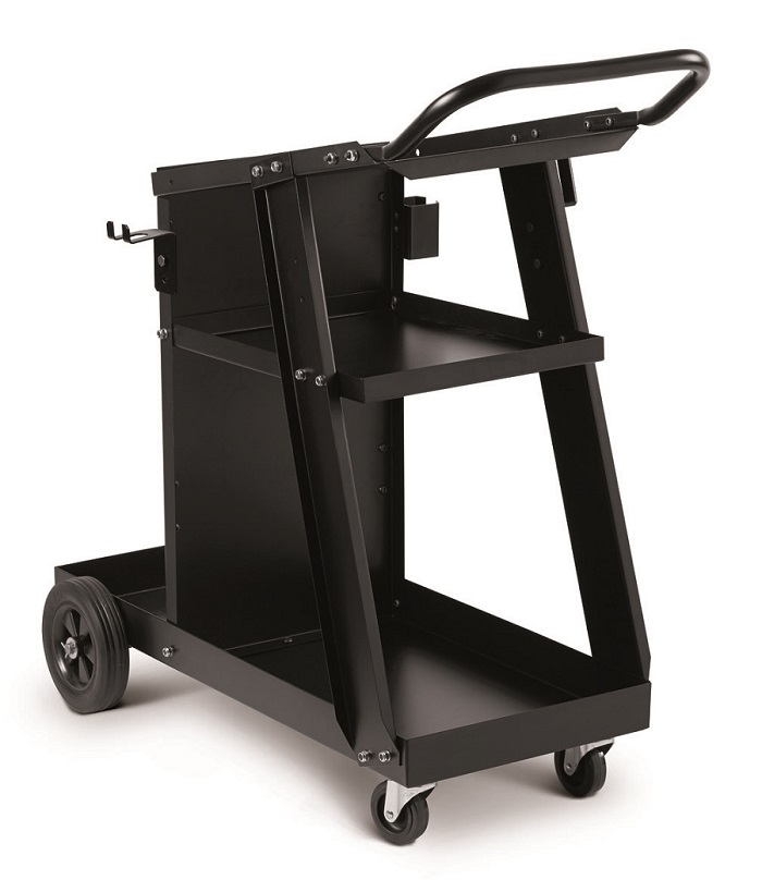 este carro porta soldadura con alojamiento para bombona de gas ( 20 L ), cómodos estantes para colocar objetos y accesorios y ganchos laterales porta antorcha y porta cable.